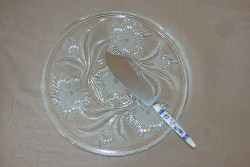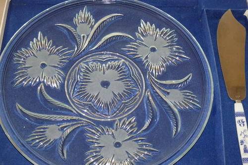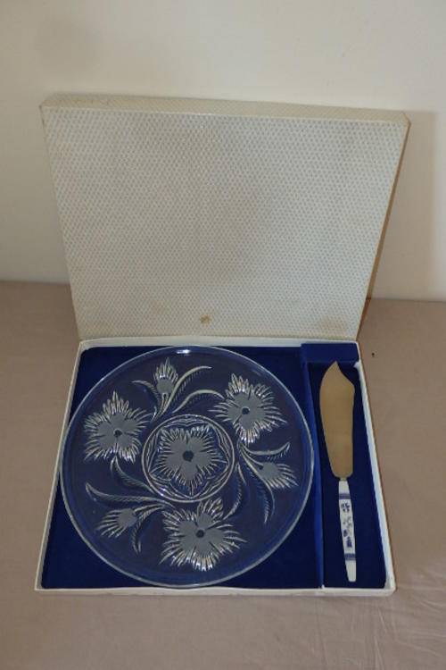 THIS BEAUTIFUL BOXED GLASS "CUT" CAKE/ PASTRY PLATTER AND CAKE SERVER IS IN EXCELLENT CONDITION AND I DOUBT THAT IT HAS EVER BEEN USED. THE ROUND GLASS PLATTER IS IDEAL FOR A LARGER CAKE OR PASTRIES OR MUFFINS ETC AND HAS ABSOLUTELY NO CHIPS OR CRACKS IN IT. THE PLATTER MEASURES 28.5cm ACROSS AND THE SERVER IS 24.5cm LONG. THERE IS A LITTLE AGE RELATED WEAR AND TEAR TO THE BOX, BUT IT HAS KEPT THE CONTENTS SAFE.
