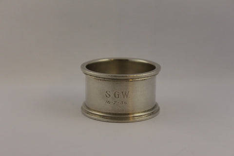 This beautiful broad classic styled antique hallmarked sterling silver napkin ring has been engraved with the initials SGW and dated 16-7-36. The napkin ring is in great condition for its age and has no visible dents or obvious scratches. The napkin ring measures roughly 4.5cm across and weighs a decent 35.81g. The hallmarks consist of the Lion Passant and Leopard Assay mark confirming the napkin ring is British Sterling silver (925) and was manufactured in London. The date stamp "r" confirms the napkin ring was made in 1932. The manufactures mark is badly stamped and is not identifiable.