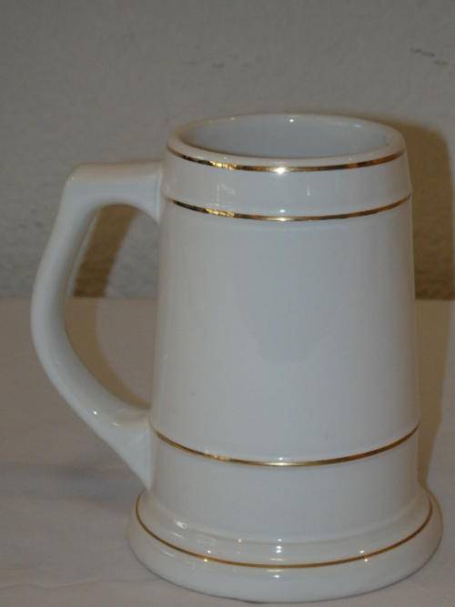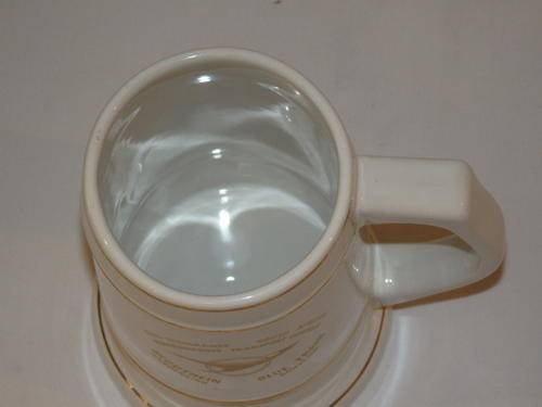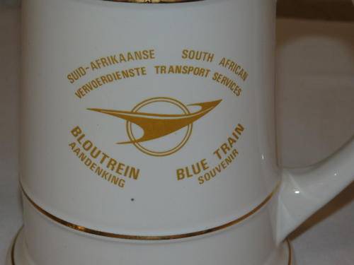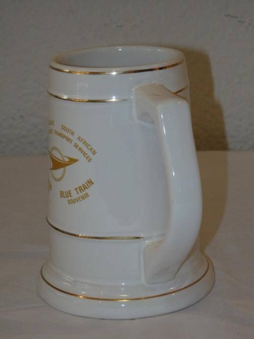 THIS IS A VERY COLLECTIBLE WHITE SOUTH AFRICAN TRANSPORT SERVICES BLUE TRAIN TANKARD MADE BY DROSTDY STONECRAFT. THE TANKARD HAS GOLD PRINT WITH THE BLUE TRAIN LOGO ON IT AND IS IN PRISTINE CONDITION WITH NO CRACKS OR CHIPS ON IT. A BEAUTIFUL PIECE OF BLUE TRAIN MEMORABILIA.IT MEASURES 14.5 cm TALL.