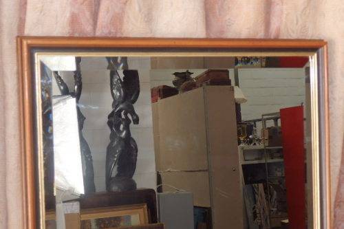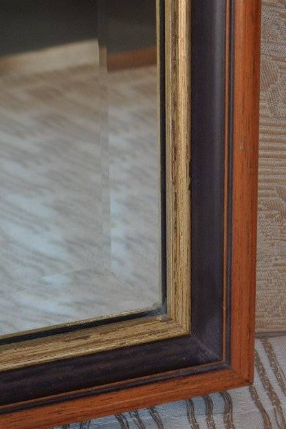 THIS BEAUTIFUL DARK WOODEN FRAMED BEVELED GLASS MIRROR WITH GOLD GILDING WOULD BE GORGEOUS IN ANY HOME AND MEASURES 555mm ACROSS x 700mm HIGH. THERE ARE TWO HANGING HOOKS ON THE ABCK OF THE MIRROR. THE MIRROR IS IN STUNNING CONDITION AND HAS ABSOLUTELY NO CHIPS OR SCUFFS ON THE BEVELED MIRROR. THERE IS MINIMAL/ NORMAL WEAR AND TEAR SCUFFS ON THE FRAME, BUT NOTHING A LITTLE TLC CAN'T SORT OUT. PLEASE VIEW THE PICS CAREFULLY TO FULLY APPRECIATE THIS WONDERFUL BEVELED GLASS MIRROR AND TO CONFIRM THE CONDITION.