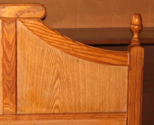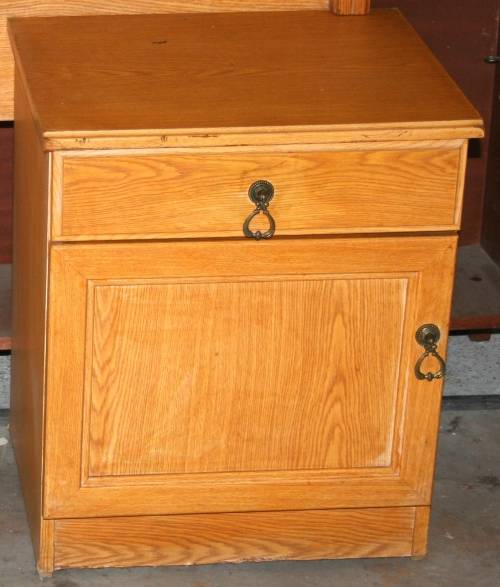 A BEAUTIFUL DOUBLE TO QUEEN PINE FINISHED HEADBOARD WITH TWO BEDSIDE CABINETS
