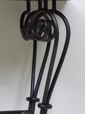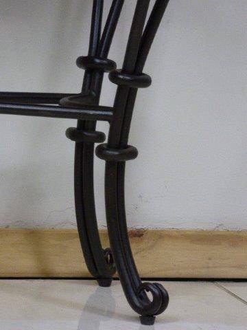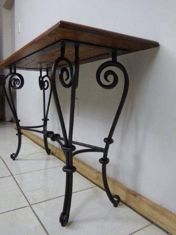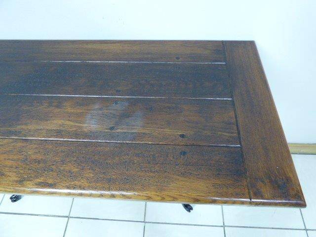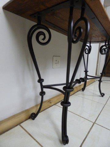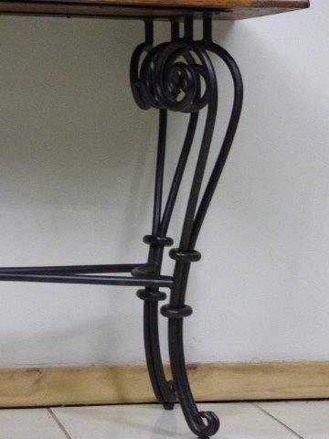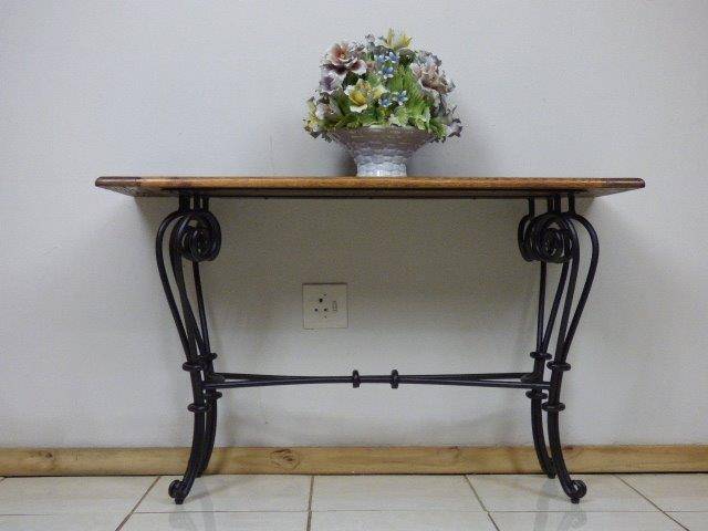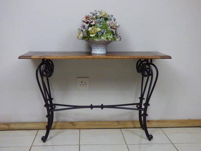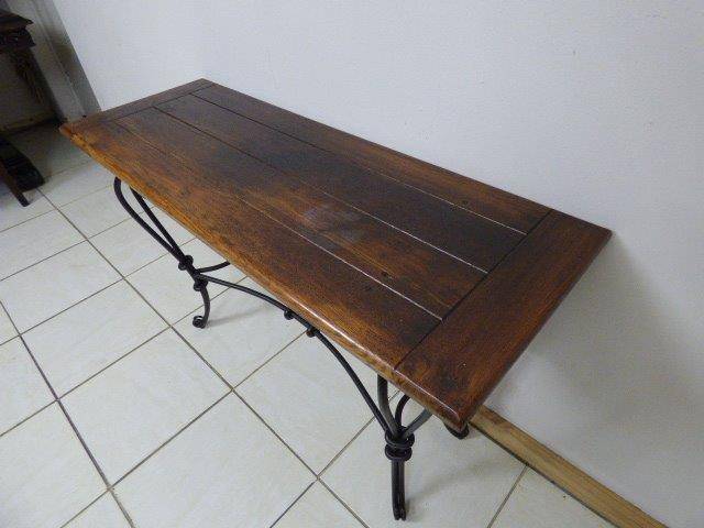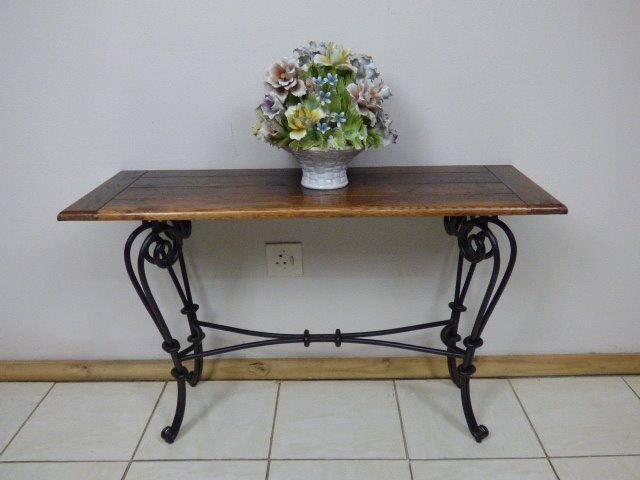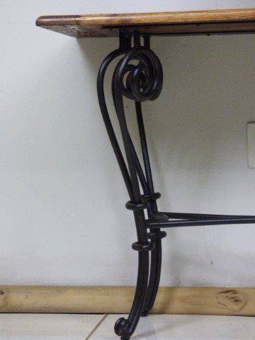 THIS STUNNING, ELEGANT AND STYLISH SOLID OAK AND WROUGHT IRON OCCASIONAL TABLE WILL SUITE ANY ROOM OR PATIO. IT HAS TONS OF CHARACTER AND IS A STUNNING PIECE OF FURNITURE - PERFECT FOR A FEATURE PIECE, ELEGANT VASE, PLANTER OR JUST FOR DISPLAY! THE WORK PUT INTO THE WROUGHT IRON BASE IS BEAUTIFUL. THE SIZE OF THE TABLE IS APPROXIMATELY 46cm x 126cm x 78cm HIGH.