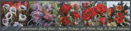 Thick application of paint with a combination of brush strokes and palette knife gives an impression of the floral theme, rather than a realistic painting.