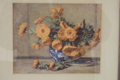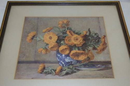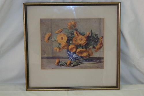 THIS BEAUTIFUL FRAMED (BEHIND GLASS) PRINT OF A VASE OF GORGEOUS ORANGE POPPY FLOWERS MEASURES 34.5cm x 32cm. THE SIGNATURE ON THE PRINT LOOKS TO BE JF GARDON? THERE ARE A FEW SCUFFS ON THE FRAME, BUT IT IS STILL A REALLY BEAUTIFUL PICTURE.