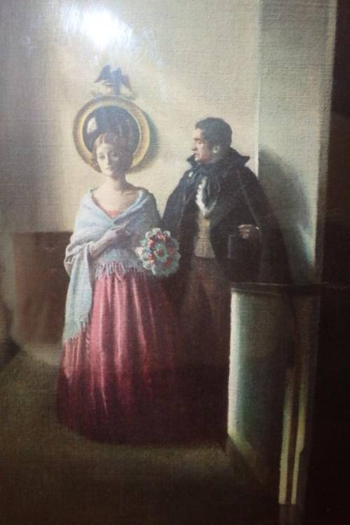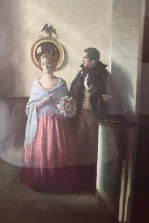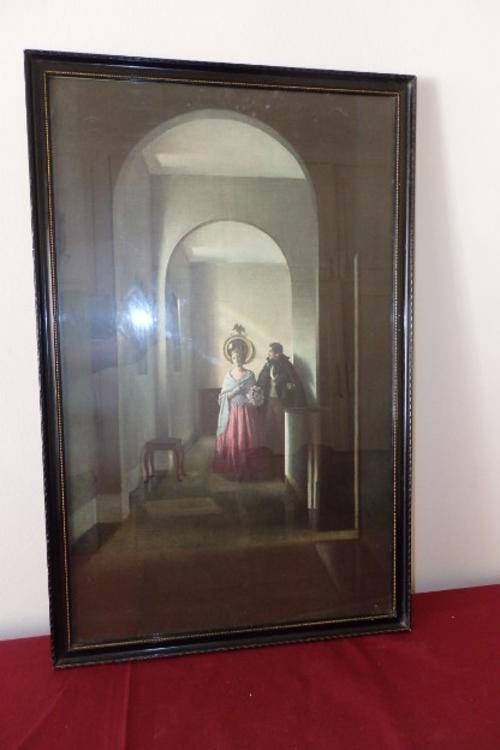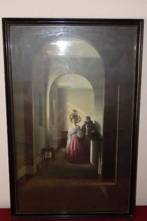 THIS BEAUTIFUL FRAMED PRINT OF A GENTLEMAN AND LADY WALKING DOWN A HALLWAY MEASURES 72.5cm x 46.5cm AND HAS BEEN FRAMED BEHIND GLASS. I WAS NOT ABLE TO DETERMINE WHO THE ORIGINAL ARTIST WAS, BUT IT IS A BEAUTIFUL PIECE IN ITS OWN RIGHTS. THERE IS SOME WEAR AND TEAR ON THE FRAME.