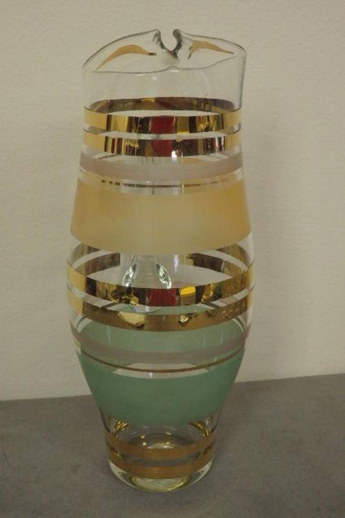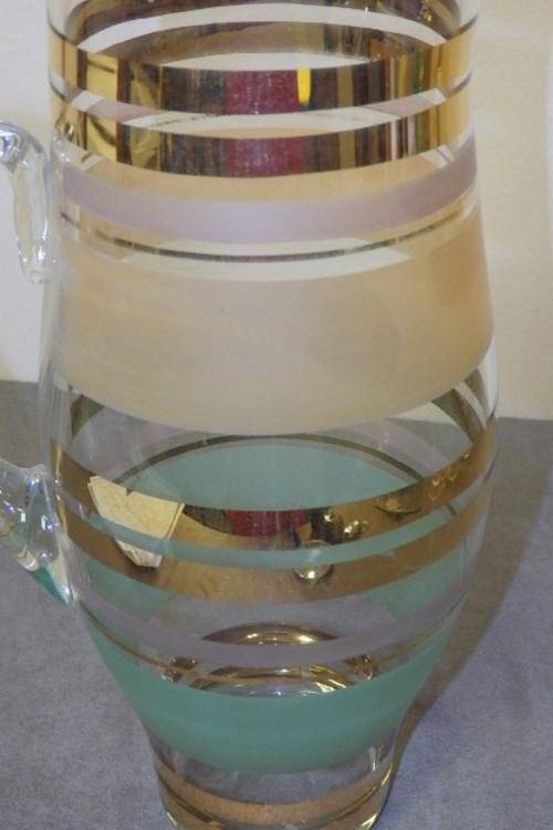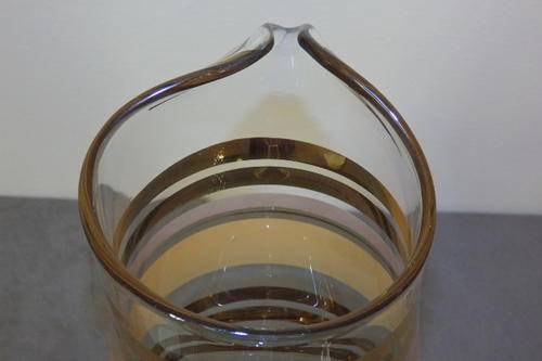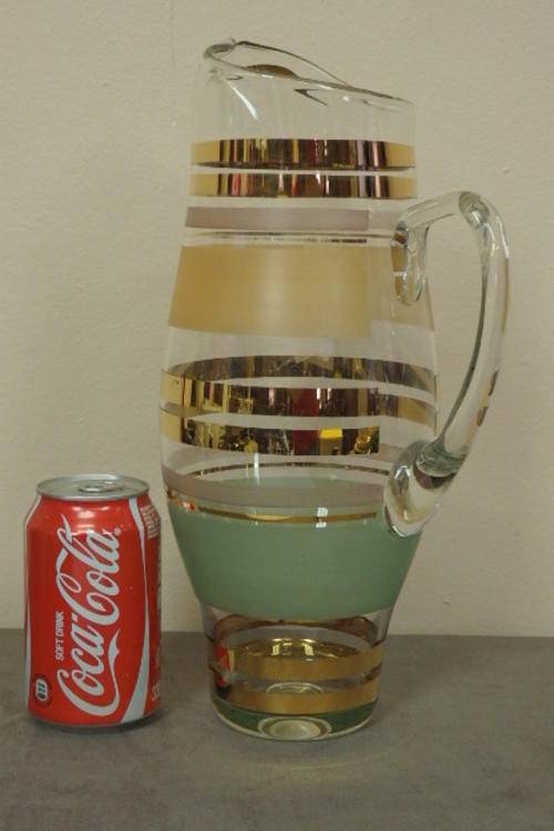 THIS SUPERB (TALL) HAND MADE "VENETIAN GLASS" JUG/ PITCHER WITH AN "ICE" LIP HAS GOLD AND PINK, YELLOW AND GREEN "PEARLESCENT" BANDS AROUND THE JUG. THE JUG IS A VERY DECENT 32.5cm TALL AND 18cm LONG INCLUDING THE HANDLE. THERE ARE ABSOLUTELY NO CHIPS OR CRACKS IN THE JUG AND IT IS EXTREMELY PRETTY AND VERY EYE-CATCHING.