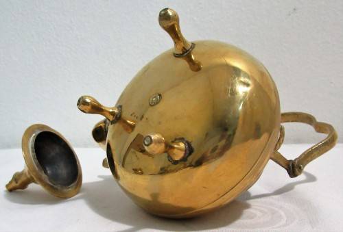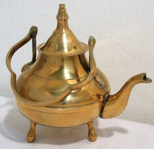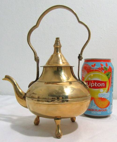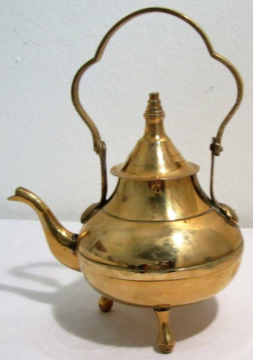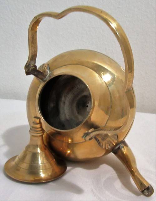 A beautiful Mid Century vintage brass footed tea kettle with gooseneck spout and the old patine
