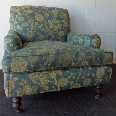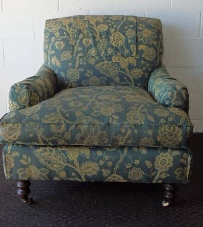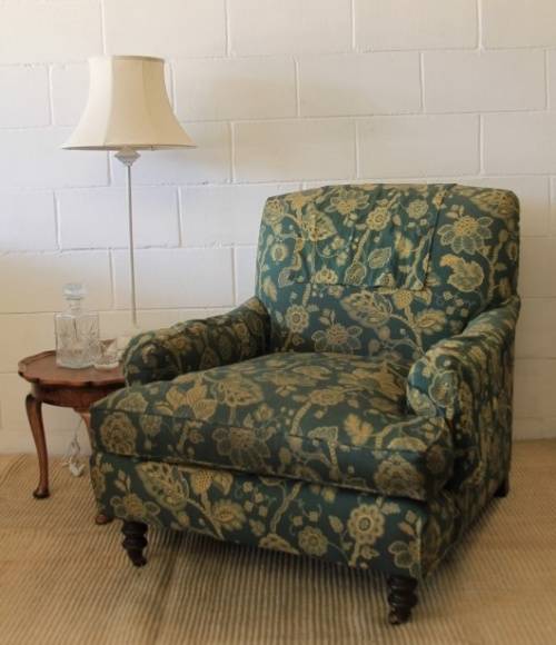 This beautiful "oversized" and very comfortable vintage arm chair is on its original mahogany wood castors and is in stunning condition. The gorgeous green and yellow "Jacquard" fabric compliments this sizeable arm chair to a "t". The arm chair measures a wonderful 85cm long x 80cm wide x 86cm high. The chair has armrest covers as well as a cloth on the backrest and would be the perfect chair in a study or library or even in a cigar lounge or living room. There is minimal/ normal wear and tear and the chair is a sure winner!!! Please view the pics carefully to fully appreciate this stunning oversized couch and to confirm the condition.