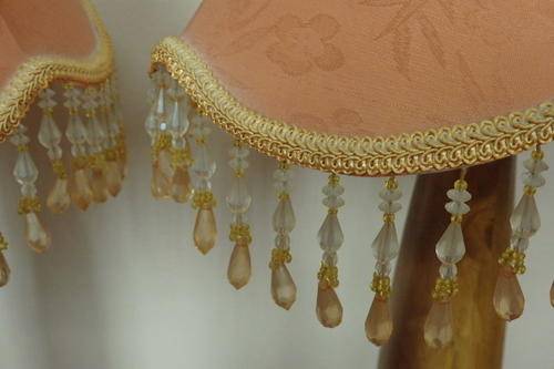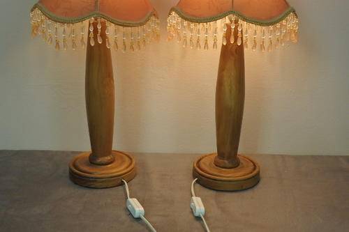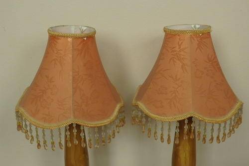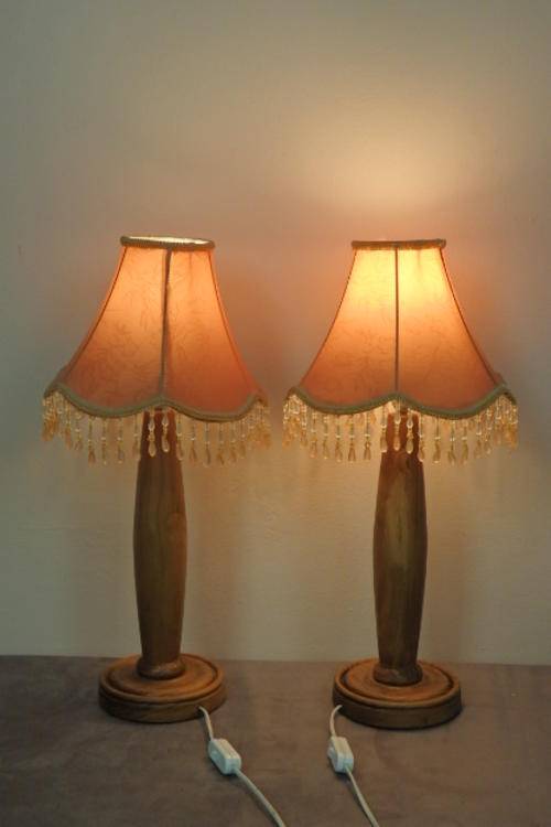 THIS BEAUTIFUL PAIR OF WOODEN BEDSIDE/ OCCASIONAL LAMPS WITH "DUSTY" PINK SHADES AND CRYSTAL-LIKE DROPS EACH MEASURE 545mm TALL. THE LAMPS ARE IN WORKING CONDITION AND HAVE INDEPENDENT ON/OFF SWITCHES. THE LAMPS AND SHADES ARE IN GREAT CONDITION.