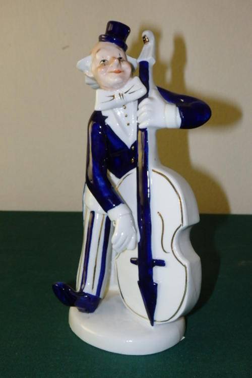 THIS STUNNING PORCELAIN COBALT BLUE AND WHITE CLOWN WITH GOLD DETAILING IS PLAYING A CELLO AND IS A REALLY AWESOME PIECE. THE CLOWN IS 19cm TALL AND IS IN GREAT CONDITION WITH NO CHIPS OR CRACKS. IF YOU ARE A COLLECTOR, THEN THIS IS DEFINITELY A CLOWN YOU SHOULD ADD TO YOUR COLLECTION.