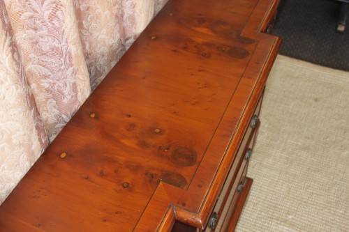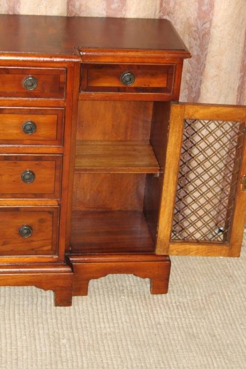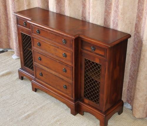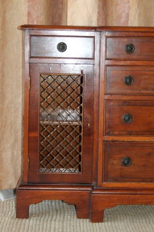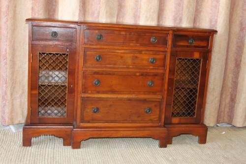 THIS BEAUTIFUL REGENCY PERIOD STYLED VINTAGE 6-DRAWER DOUBLE DOOR HALLWAY CABINET WITH TRELLIS DOOR DETAILING IS A BEAUTIFUL PIECE OF FURNITURE. THE NARROWER STYLED CABINET IS THE IDEAL CABINET FOR A HALLWAY OR IN A BEDROOM OR FOR THAT WALL THAT JUST NEEDS A LITTLE SOMETHING SPECIAL. THE CABINET MEASURES 1170mm LONG x 340mm WIDE x 765mm HIGH. THE CABINET HAS A SERIES OF FOUR LARGER CENTRAL DRAWERS WITH A TRELLIS DETAILED DOOR ON EITHER END OF THE CABINET AND A SMALLER DRAWER ABOVE EACH OF THE DOORS. THE CABINET IS IN AWESOME CONDITION FOR ITS AGE AND HAS MINIMAL/ NORMAL AGE AND USAGE RELATED WEAR AND TEAR. PLEASE VIEW THE PICTURES CAREFULLY TO FULLY APPRECIATE THIS STUNNING HALLWAY CREDENZA CABINET AND TO CONFIRM THE CONDITION.