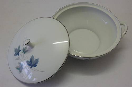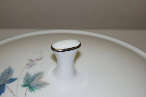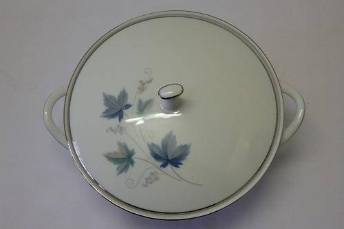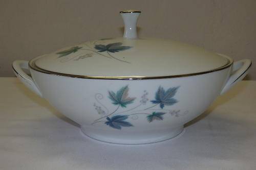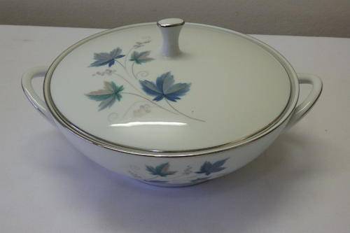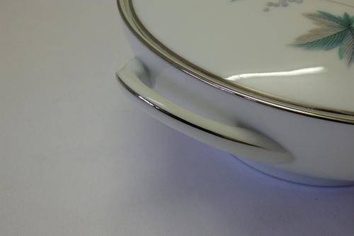 THIS STUNNING "ROYAL CERAMICS" BY NORITAKE OF JAPAN "VINTAGE SERIES" PATTERN NUMBER 618, SET OF 2 LIDDED SERVING BOWLS EACH MEASURE 26.7cm (HANDLE TO HANDLE) x 13cm HIGH INCLUDING THE LID. THE EXQUISITE CRISP WHITE OF THE CHINA HAS BEEN BEAUTIFULLY FINISHED WITH SILVER GILDING AND A PATTERN WITH SOFT GREY AND GREEN LEAVES WITH SWIRLS. THERE ARE ABSOLUTELY NO CHIPS OR CRACKS IN THE PORCELAIN AND THE SET DOES NOT EVEN LOOK AT THOUGH IT WAS EVER USED. ALTHOUGH THE BACK STAMP DOES NOT SAY NORITAKE, I BELIEVE THAT "RC" ROYAL CERAMICS FALLS UNDER THE NORITAKE BANNER. PLEASE NOTE THAT YOU ARE BIDDING PER LIDDED SERVING BOWL TO TAKE THEM BOTH.