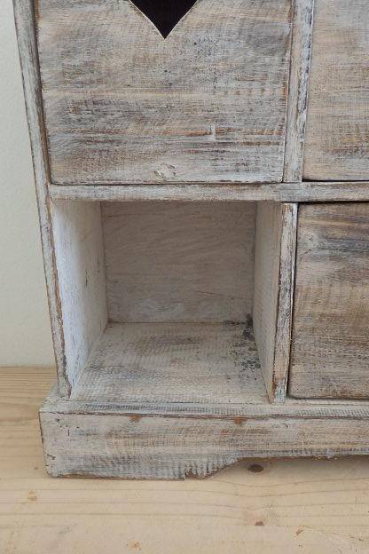 THIS BEAUTIFUL SOLID WOODEN SIX-DRAWER STORAGE CABINET WITH A GORGEOUS PAINT TECHNIQUED EXTERIOR MEASURES 530mm LONG x 177mm DEEP x 380mm HIGH. THE DRAWERS CAN BE INDIVIDUALLY REMOVED FOR PIGEON HOLES. THERE IS A HEART SHAPED CUT-OUT ON EACH OF THE DRAWERS. THE DRAWERS ARE PERFECT FOR ARTS SUPPLIES OR PROJECTS OR WOULD BE AMAZING MOUNTED ON A BATHROOM WALL.