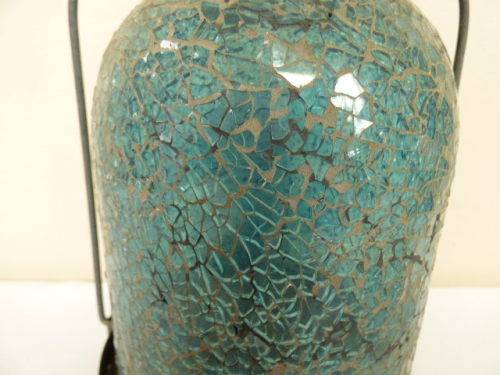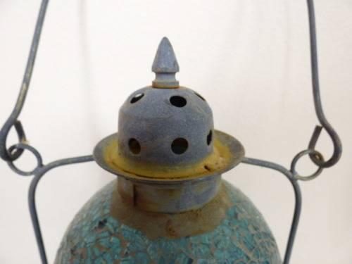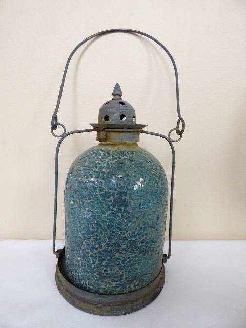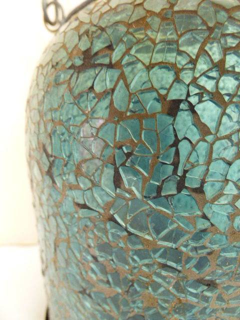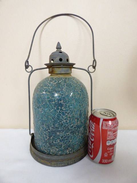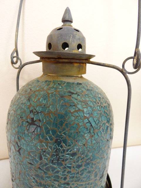 THIS ABSOLUTELY GORGEOUS STAINED BLUE GLASS MOSAIC TABLE OR HANGING CANDLE LANTERN A LOVELY WARMTH TO IT. IT HAS STUNNING COLOUR IN THE GLASS AND WILL LOOK FABULOUS OUTSIDE OR IN THE LAPA!!! THE LANTERN STANDS APPROXIMATELY 29cm HIGH. THERE IS AGE RELATED WEAR ON THIS CHARMING PIECE.