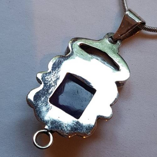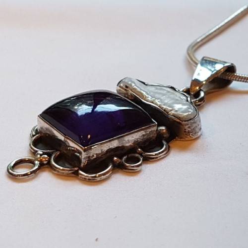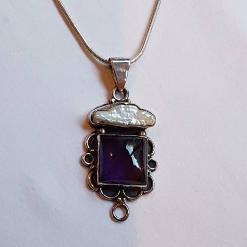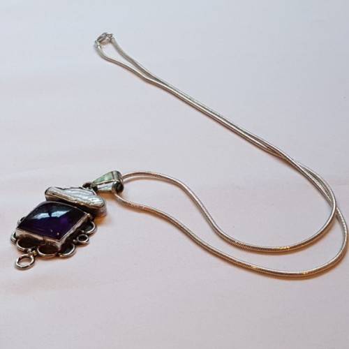 This beautiful sterling silver pendant with a large square Amethyst stone and a gorgeous white baroque pearl is hanging on a stunning 54cm sterling silver neck chain. The pendant is 5.5cm long x 2.5cm wide and has a combined weighs of 21.46g (chain and pendant). This awesome and unusual pendant is beautifully made and would make a great gift for a special lady. There is minimal/ normal wear and tear, but nothing a good polish can't sort out. Please view the pics carefully to fully appreciate this awesome sterling silver pendant on a silver chain and to confirm the condition.
