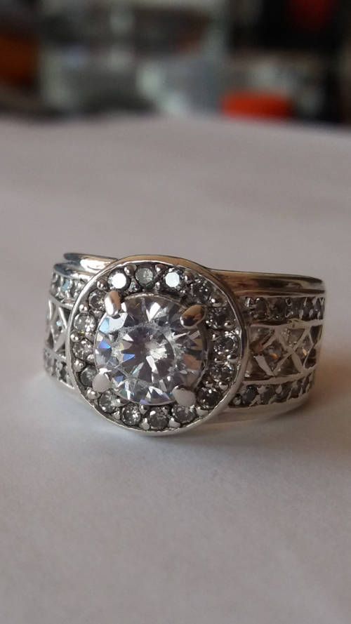 A BEAUTIFUL STERLING SILVER RING SET WITH A CENTER GEM WITH GORGEOUS GEMS AROUND. WIDTH ON TOP:12MM. WIDTH INSIDE:15MM. WEIGHT: 6.3 GRAMS. PLEASE HAVE A LOOK AT MY OTHER QUALITY JEWELLERY ITEMS, ALL START AT R1 NO RESERVE PRICE. FOR POSTAL SAVING YOU CAN COMBINE PACKAGES.