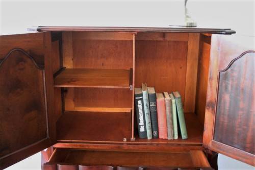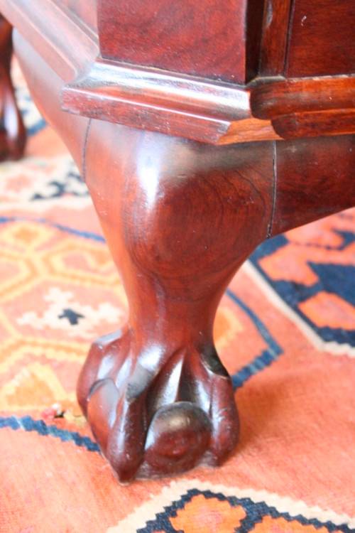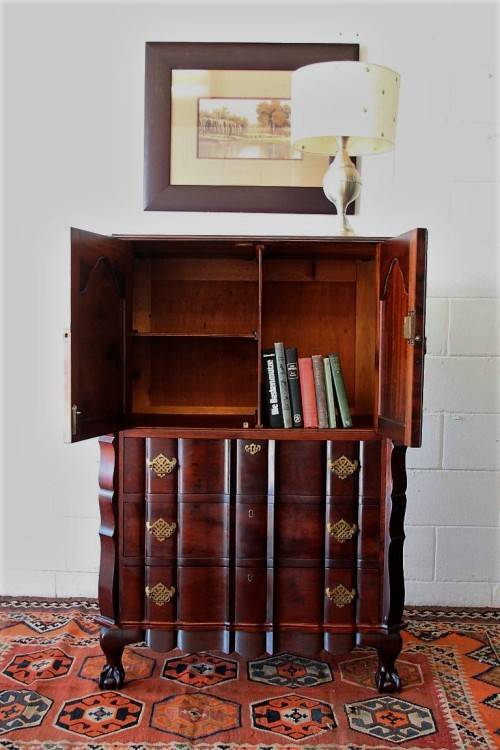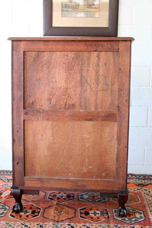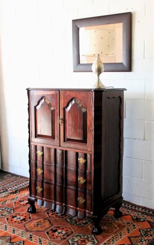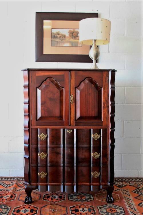 This versatile vintage ball and claw "Tallboy" cabinet measures 84cm long x 50cm wide x 123cm high. The cabinet is in stunning condition with minor/ normal age and usage related wear and tear. The cabinet features stunning scalloped edges and brass handlesdesign, it really looks wonderful. The cabinet has three nice sized drawers and shelves in the top cupboard section. This is a very versatile cabinet and would look stunning in any room in the home. Please view the pics carefully to fully appreciate this stunning vintage cabinet and to confirm the condition.
