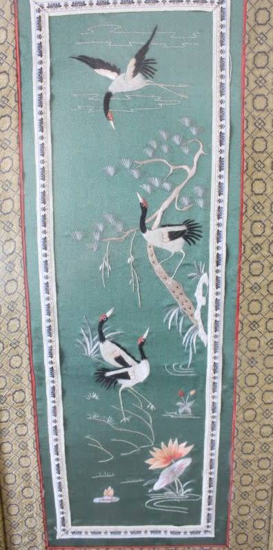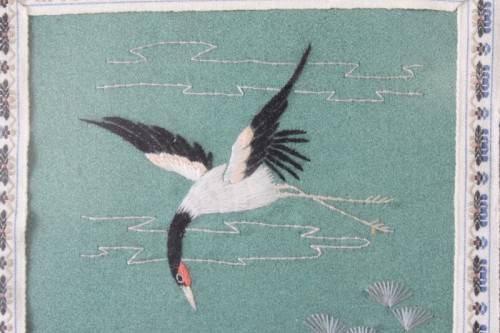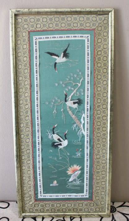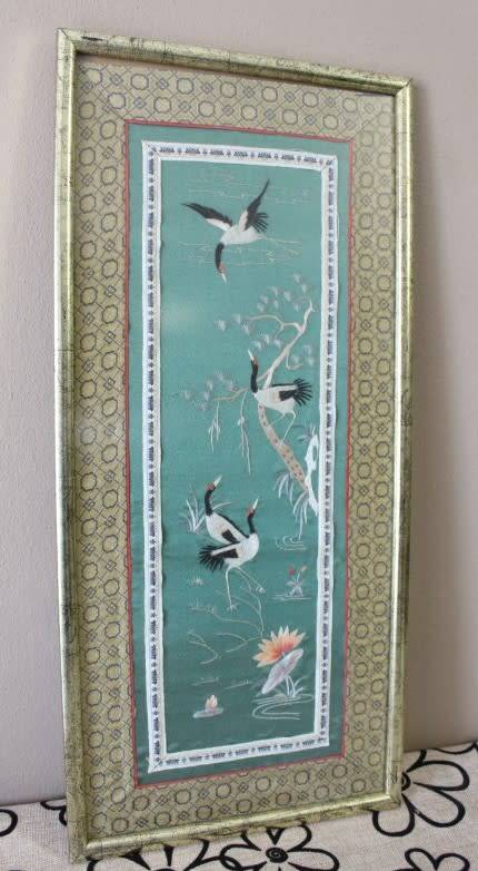 This beautiful Japanese themed embroidery on silk of a bird with flowers picture measures 22cm wide x 59cm high. It has soft flowing shades of blue, green and brown and would fit with most decor in the home.There is minor age and usage related wear and tear. Please view the pics carefully to fully appreciate this awesome picture and to confirm the condition. Please view the shipping options or request courier costs prior to purchasing any of our products.
