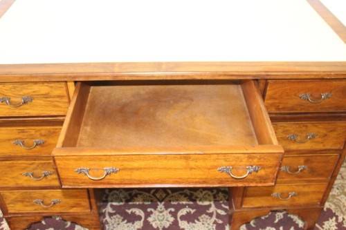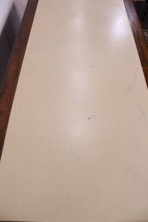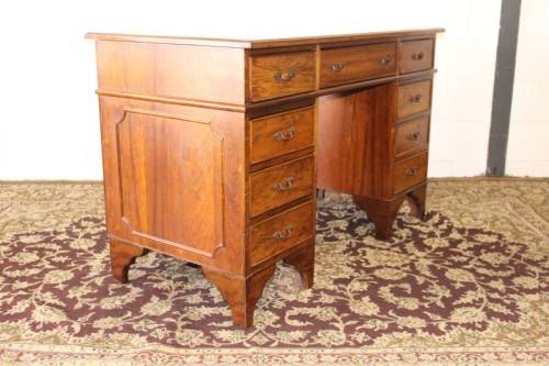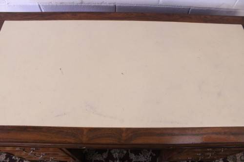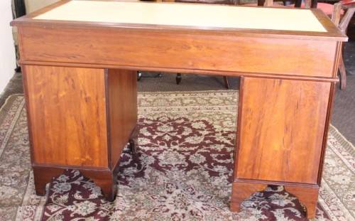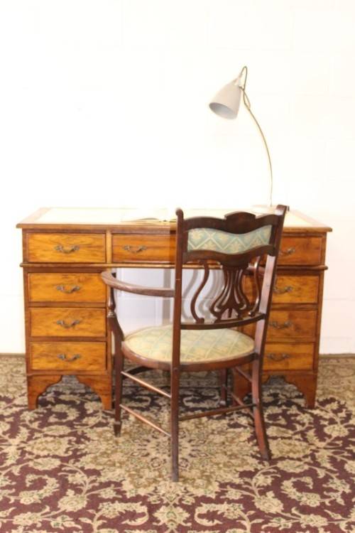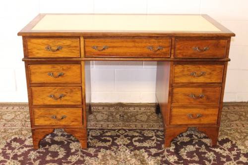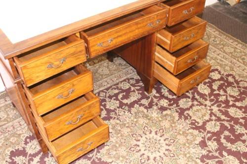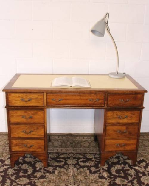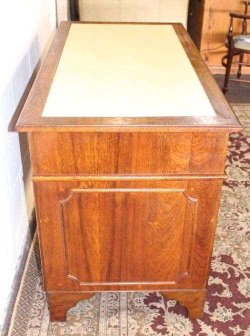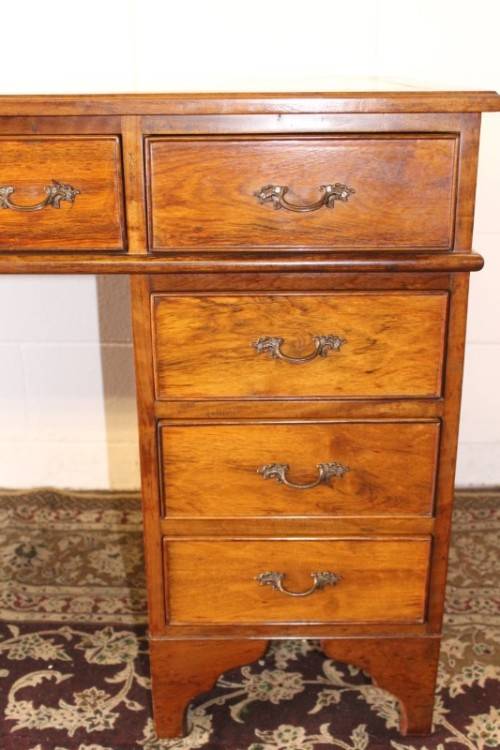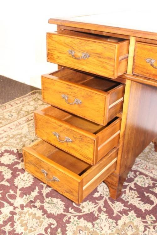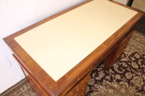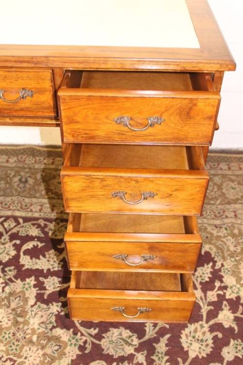 This beautiful vintage knee-hole writing desk with an off-white leather top and nine drawers with brass handles is the ideal desk for a study or home office or even in a living area. The desk measures 122cm long x 61cm wide x 76.5cm high. The desk is in good vintage condition with normal age and usage related wear and tear and scuffs etc (see pics). The desk has four drawers in each pedestal and one drawer in between them under the writing top. Please note that there are no keys for the drawers and the chair is not included. As far as I can tell, the off-white top is a PU-leather. There are some scuffs and scrapes on the leather - see pics. Please view the pics carefully to fully appreciate this wonderful vintage writing desk and to confirm the condition. Please view the shipping options or request courier costs prior to purchasing any of our products.
