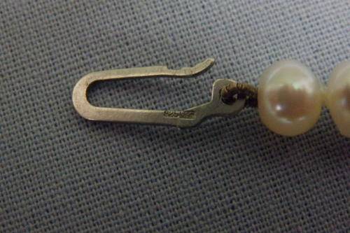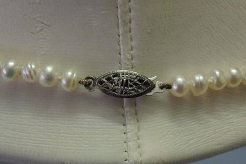 THIS BEAUTIFUL WHITE PEARL LADIES NECKLACE WITH A "VINTAGE" STYLE STERLING SILVER (STAMPED 925) SAFETY CLASP HAS A SERIES OF DARK BLUE BEADS IN BETWEEN THE PEARLS THAT MAKES IT SOMETHING DIFFERENT. THE NECKLACE MEASURES 43cm LONG AND IS IN AWESOME CONDITION. THE NECKLACE HAS NEVER BEEN WORN AND IS EX-SHOP STOCK. THIS IS A GORGEOUS GENUINE PEARL NECKLACE.