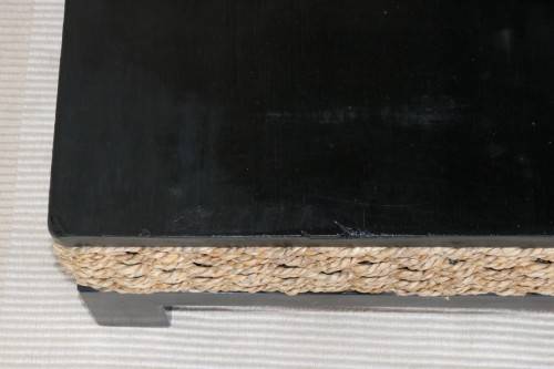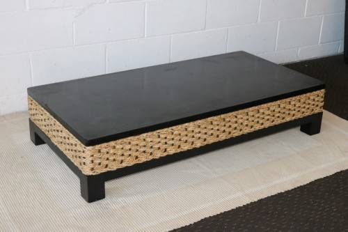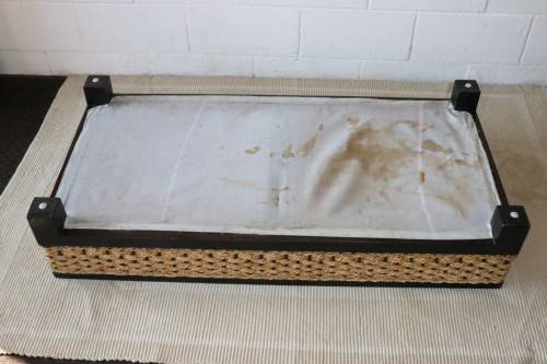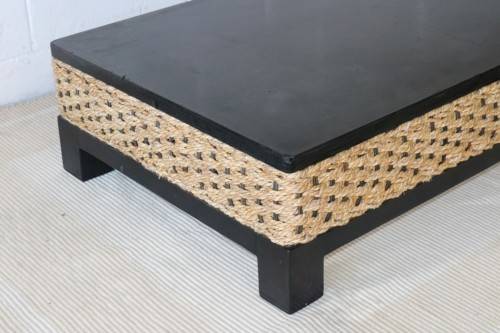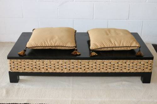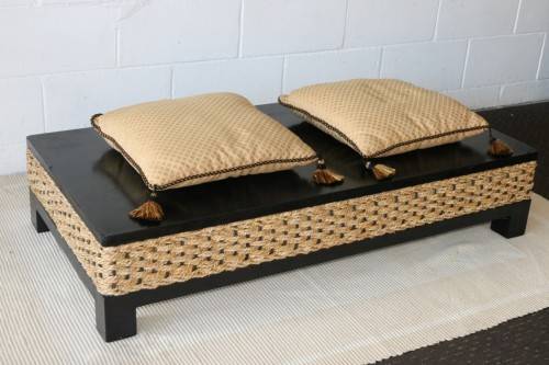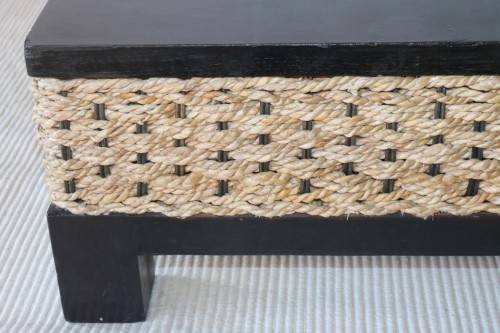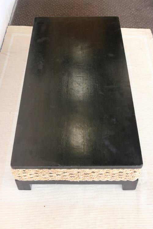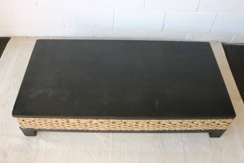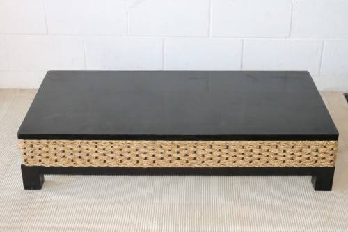 This beautifully made ebony-stained wooden and wicker low coffee table looks lovely and stylish and measures 120cm long x 60cm wide x 25cm high. The table has a modern lower design that is very popular these days and it would look stunning on a patio or even as a center coffee table in a living room/ entertainment room. There is some usage wear and tear to the wood as well as some scuffs but is looks great overall. This could even be used as a modern, low bench - see the last two pics in the description. Please view the pics carefully to fully appreciate this coffee table and to confirm the condition. (Please note cushions are not included).