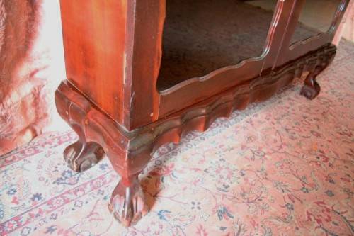This exquisite vintage glass two door Imbuia ball and claw showcase/ bookcase is ideal for a study or office or even an entertainment room for a collection such as porcelain, model cars etc. The cabinet measures 126cm long x 27cm wide x 128cm high. There three wood shelves in the cabinet. There is a key for the doors of this cabinet.This is a very versatile cabinet and would look lovely no matter where you display it. There is minor/ normal age and usage related wear and tear associated with a vintage piece. Please view the pics carefully to fully appreciate this gorgeous cabinet and to confirm the condition. Please view the shipping options or request courier costs prior to purchasing any of our products.