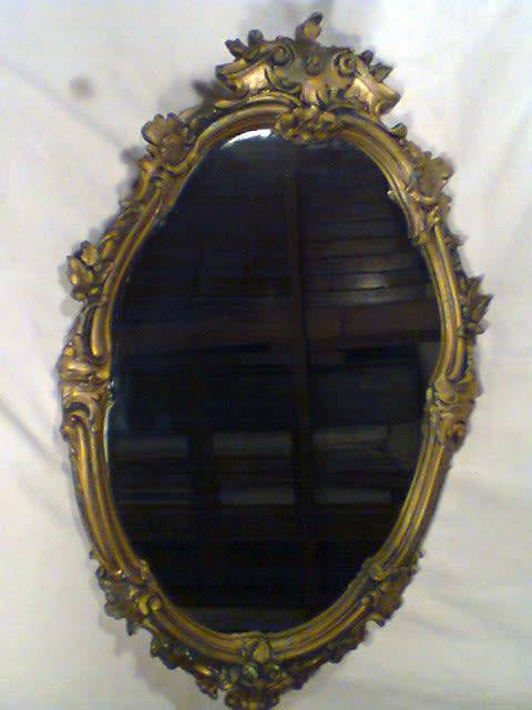 A Beautiful vintage Oval ornate wall mirror , ideal for that special room. The gold is tarnishing a little from age. Size: 700mm Tall x 430mm Wide.The back has a heavy chain.