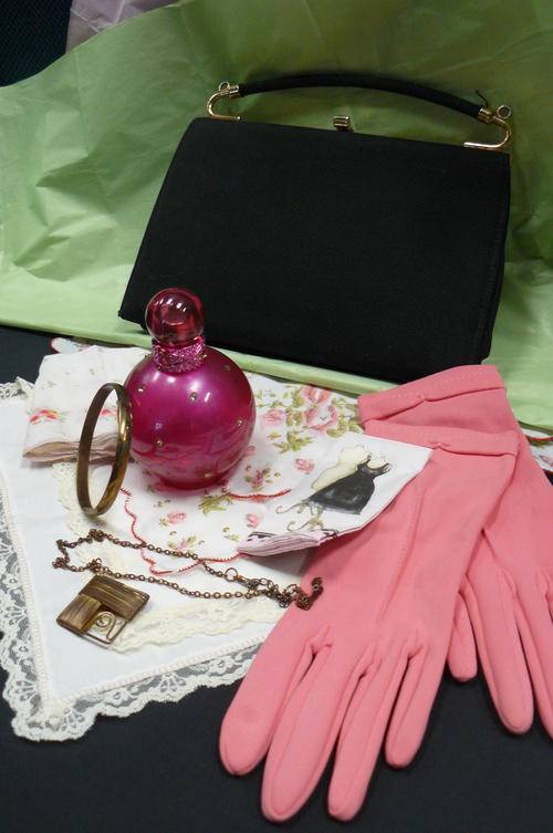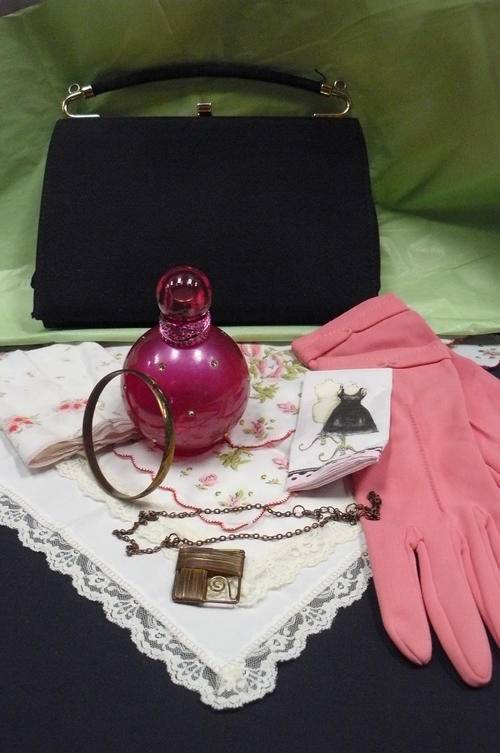 HANKIES, BAG, NECKLACE, PERFUME BOTTLE FOR DISPLAY - VERY PRETTY