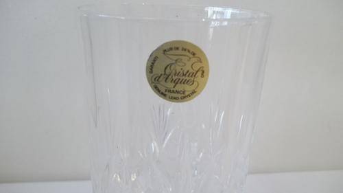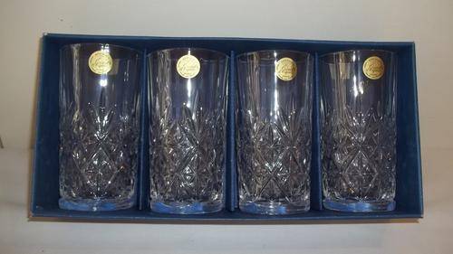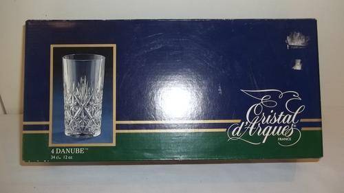 THIS STUNNING BOXED SET OF FOUR FRENCH MADE CRISTAL d' ARQUES "DANUBE" DRINKING GLASSES STILL HAVE THE ORIGINAL TAGS ON EACH OF THE LEAD CRYSTAL GLASSES. THE DESIGN OF THE DANUBE SERIES IS TRULY QUITE BEAUTIFUL AND WOULD BE FANTASTIC AS PART OF YOUR CRYSTAL COLLECTION. THE GLASSES ARE 340ml.