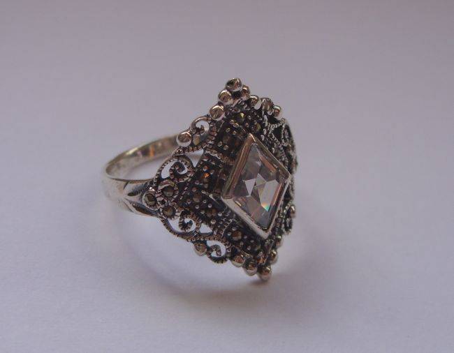A BREATHTAKING STERLING SILVER RING SET WITH MARCASITE & A CLEAR FACETED STONE !!! MUST HAVE !!!