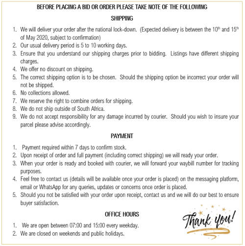 R65.00 Standard shipping applies to orders under R100.00, in most areas in South Africa. R35.00 Standard shipping applies to orders over R100.00. Some areas may attract a surcharge surcharge. This will be calculated at checkout if applicable. Check my rate