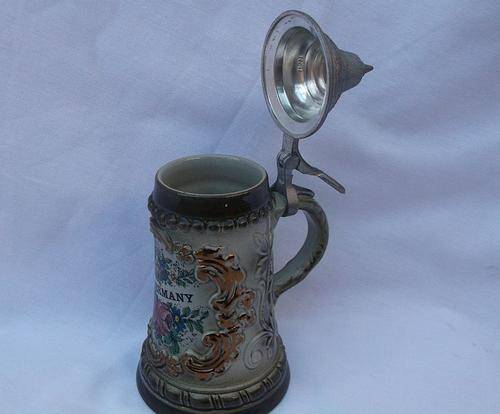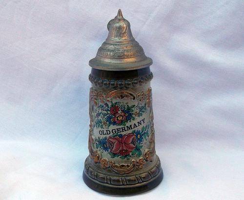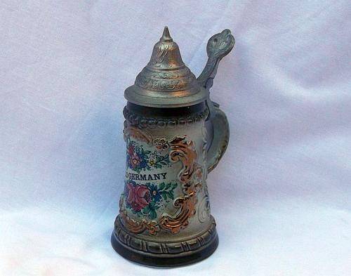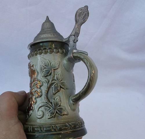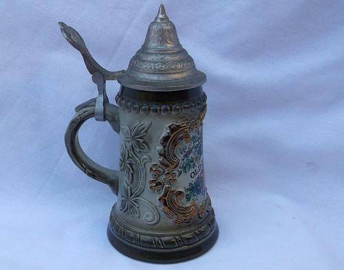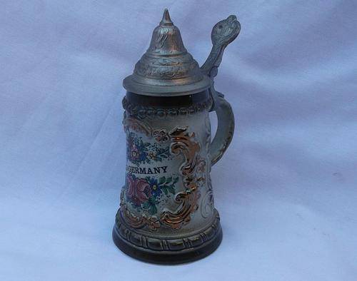 An eye catching vintage pewter lidded beer stein stamped KING and numbered