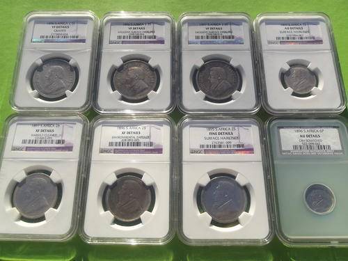 Up for this auction is a big collection of 8 x ZAR Details graded Silver Coins slabbed by NGC!!! Some beautiful coins here!!! These are: 2 x VF ZAR 1896 2.5 Shillings, 1 X VF ZAR 1897 2.5 Shillings, 1 x XF ZAR 1897 2 Shillings, 1 x XF ZAR 1896 2 Shillings, 1 x Fine ZAR 1895 2 Shillings, 1x AU ZAR 1897 1 Shillings and 1 x AU ZAR 6p. A never to be repeated opportunity to aquire a collection of clean NGC-slabbed ZAR silver coins!!! Your bid is to take the lot - R1 start!!!
