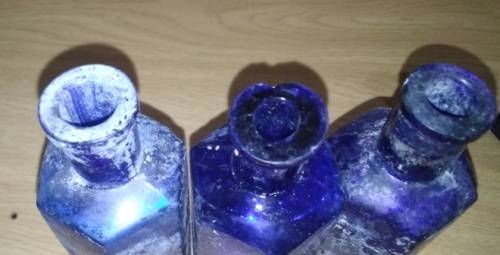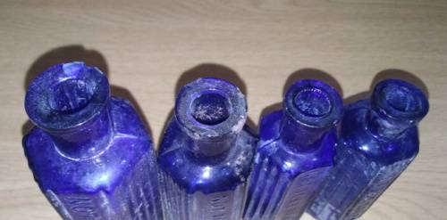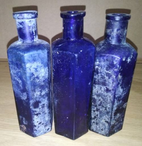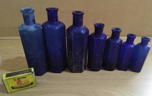 This collection includes 7 Cobalt blue, hexagonal-shaped bottles in descending sizes with the words Not To Be Taken on all of them. The bottles show wear and tear. None of them have cracks but some of their lips are chipped. See photographs for condition of the bottles.