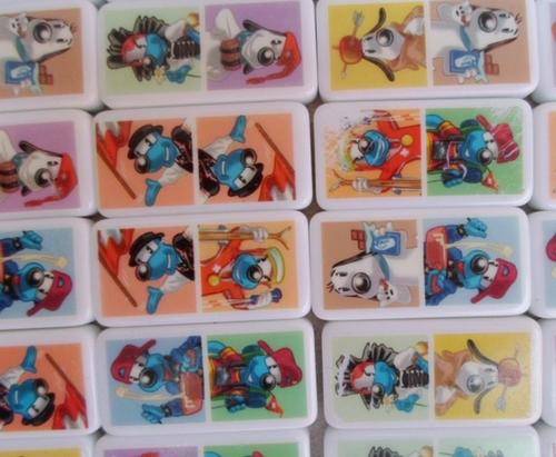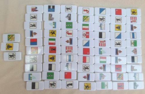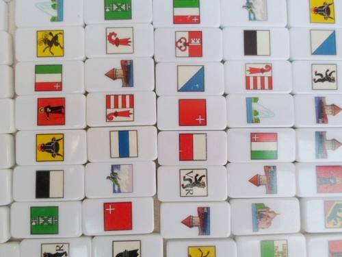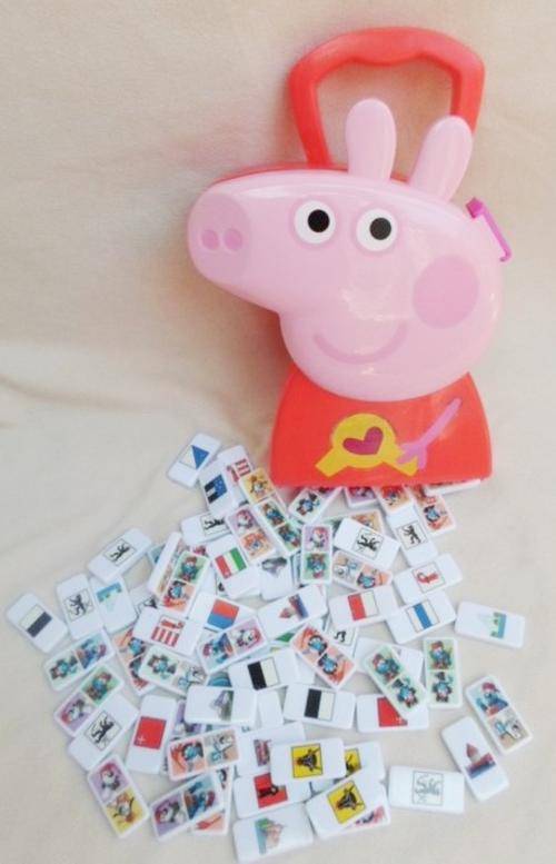 A CUTE HARD PLASTIC 'PEPPA PIG' CASE - 27CM X 19CM X 6CM IN GOOD CONDITION WITH 73 CERAMIC DOMINOES FEATURING COUNTRY FLAGS AND COAT OF ARMS ON THE ONE SIDE A CUTE CARTOON-LIKE CHARACTERS ON THE OTHER SIDE - LOADS OF EDUCATIONAL FUN TO BE HAD! REFER IMAGES