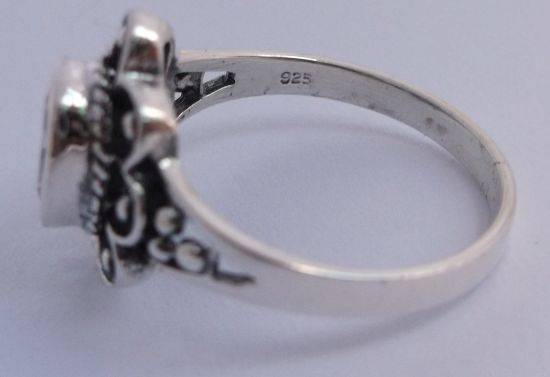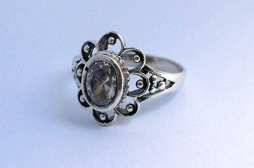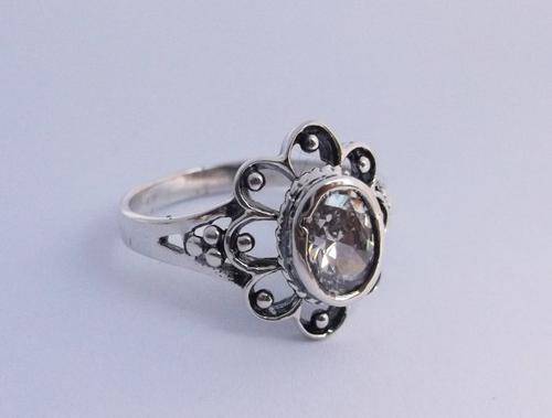 A DAZZLING STERLING SILVER RING SET WITH A FACETED CLEAR STONE .....