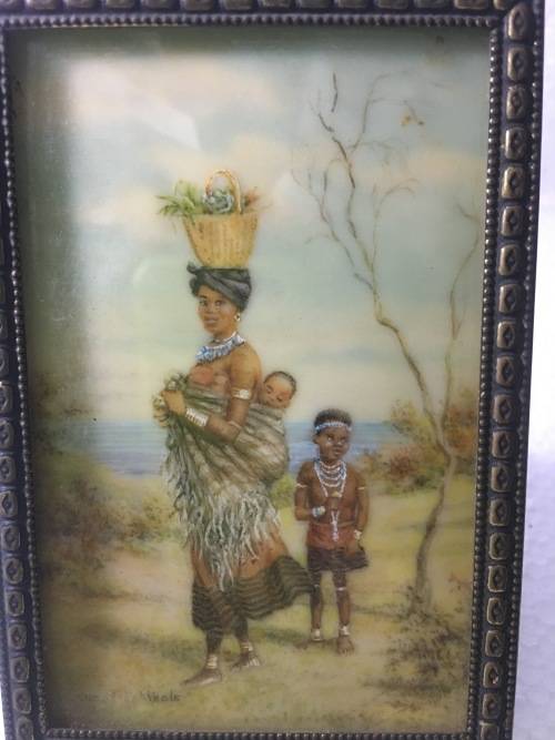 A miniature Mother and Child African theme painted on what looks like a bone material. Signed by Diane Mallet Veale date unknown in glass frame measuring approximately 9cm by 6cm.
