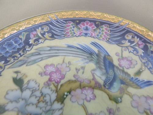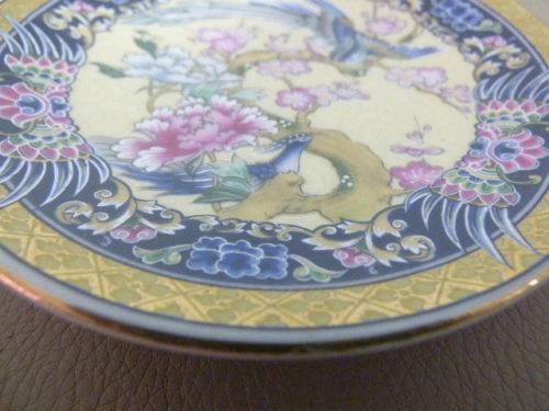A BEAUTIFUL VERY ELABORATE AND COLOURFUL PIN PLATE MADE IN JAPAN. IT HAS A STUNNING GOLD RIM AND WILL LOOK FABULOUS ON DISPLAY.THIS PLATE IS IN EXCELLENT CONDITION AND MEASURES APPROXIMATELY 11.5cm. STUNNING TO ADD TO YOUR CURRENT PLATE COLLECTION.