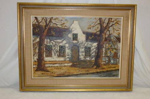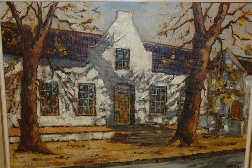 THIS FABULOUS ORIGINAL FRAMED OIL ON BOARD PAINTING OF THE FRONT OF A BEAUTIFUL CAPE DUTCH HOUSE IS SIGNED BY ARTIST WEBB AND MEASURES 65cm x 50cm. THE GORGEOUS VINTAGE FRAME (1970's) ABSOLUTELY COMPLIMENTS THE PAINTING. THERE ARE SOME SCUFFS AND MARKS ON THE FRAME, BUT IT DOES NOT DETRACT FROM THIS AMAZING PAINTING.