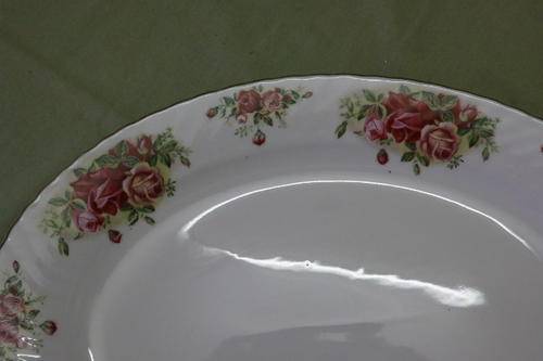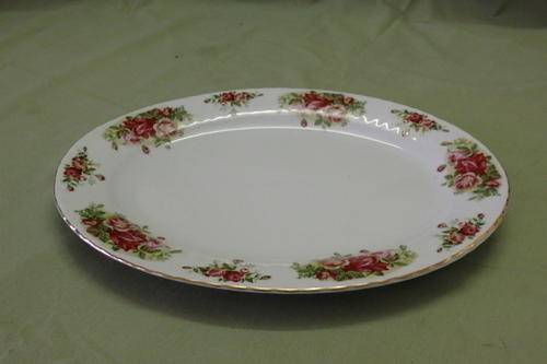 THIS STUNNING ROYAL CHINA PORCELAIN OVAL FOOD PLATTER IN THE GORGEOUS ENGLISH ROSE PATTERN MEASURES A VERY DECENT 34.5cm x 25.5cm AND IS IN GREAT CONDITION WITH MINIMAL AGE AND USAGE RELATED WEAR AND TEAR AND NO CHIPS OR CRACKS IN ANY OF THE PIECES. THE BEAUTIFUL ROSE TRANSFER PRINT PATTERN IS SET ON CRISP WHITE PORCELAIN AND FINISHED WITH A GOLD GILDER RIM.