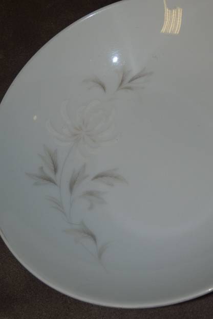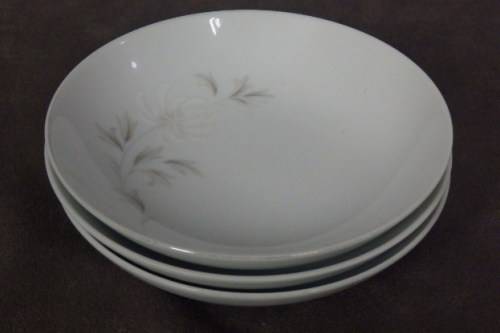 THIS FANTASTIC SET OF THREE NORITAKE OF JAPAN BONE CHINA DESSERT BOWLS IN THE AWESOME ROWENA PATTERN (NO. 6322) EACH MEASURE 14.3cm ACROSS. THE SOFT PATTERN OF THE ROWENA RANGE IS MADE UP OF WHITE AND TAN FLOWERS WITH GREY/TAN LEAVES SET ON A CRISP WHITE PORCELAIN. THE PATTERN HAS BEEN TONED DOWN TO JUST BE VISIBLE ON THE PORCELAIN. THE ROWENA PATTERN IS FINISHED WITH PLATINUM RIMS. THERE IS MINIMAL WEAR AND TEAR AND SOME TARNISHING OF THE GILDING.