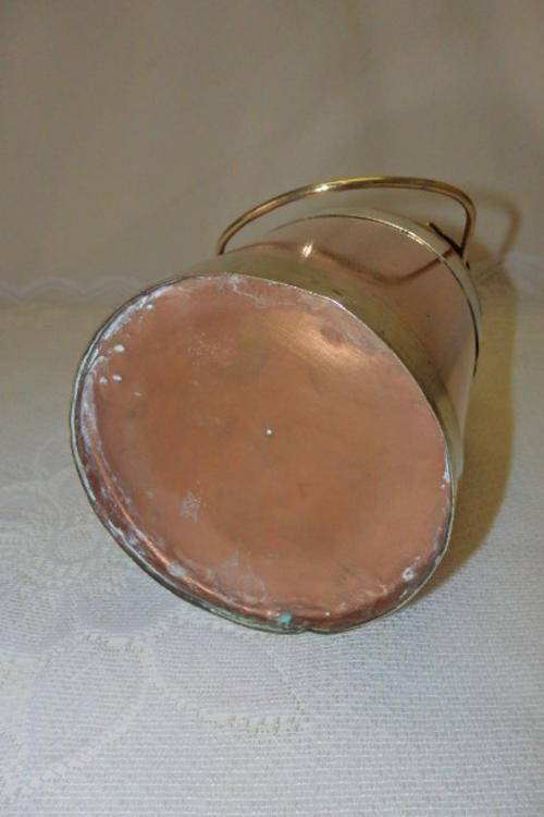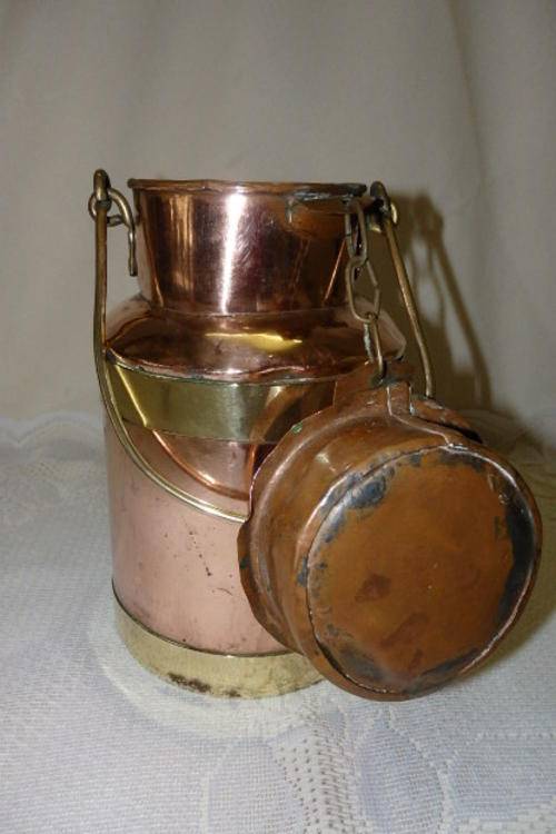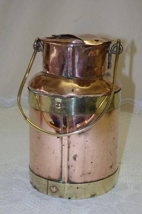 THIS SERIOUSLY GORGEOUS ANTIQUE COPPER AND BRASS CREAM CAN HAS LOADS OF CHARACTER AND MEASURES 19.5cm TALL BY 12cm ACROSS THE BASE. ONCE THE MILKING WAS COMPLETED, THE FARMERS WOULD SKIM THE CREAM OFF THE TOP OF THE MILK AND PUT THE CREAM INTO CANS SUCH AS THIS ONE. THE MILK WENT INTO MUCH LARGER CANS. THE CAN STILL HAS THE ORIGINAL LID AND CONNECTING CHAIN WITH THE BRASS CARRY HANDLE. IT IS AN AWESOME CREAM CAN AND A GREAT COLLECTORS PIECE.