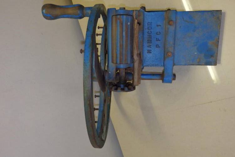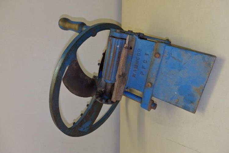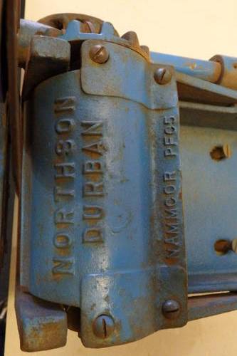 THIS ABSOLUTELY FANTASTIC ANTIQUE BLUE NAMMCOR "NORTHSON" "DURBAN" MECHANICAL TOBACCO CUTTER AND SHREDDER MEASURES 50cm LONG x 42cm WIDE AND IS 25cm HIGH. ONCE THE ROTATING HANDLE IS TURNED, THE TOBACCO LEAVES ARE FORCED BETWEEN THE SHREDDER BLADES ANF THEN CUT INTO SECTIONS BY THE ROTATING BLADES ON THE HANDLE.