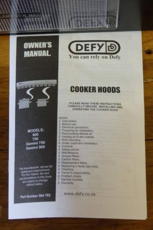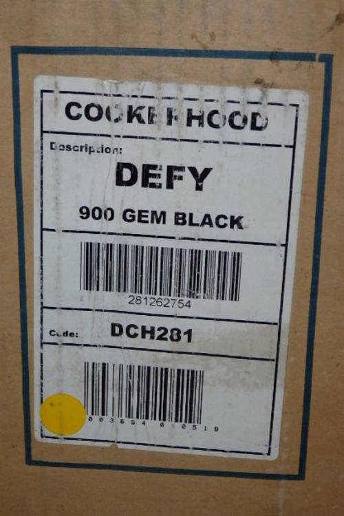 THIS FANTASTIC BLACK "DEFY 900" "GEMINI SERIES" (MODEL DCH281) DUAL FAN EXTRACTOR/ COOKER HOOD IS STILL IN ITS ORIGINAL BOX AND PACKAGING AND HAS NEVER BEEN USED. THE COOKER HOOD HAS A POLYESTER AND A CHARCOAL FILTER SYSTEM, DUAL FANS, DUAL LIGHTS AND A GLASS SWIVEL SCREEN. THE USER MANUAL IS ALSO IN THE BOX. THE EXTRACTOR FAN IS IN NEAR PRISTINE CONDITION AND STILL HAS ITS PROTECTIVE COVERS ON THE EXTRACTOR CONNECTIONS. IF YOU ARE RENOVATING OR WANT A LARGER EXTRACTOR FAN, NOW IS YOUR OPPORTUNITY.