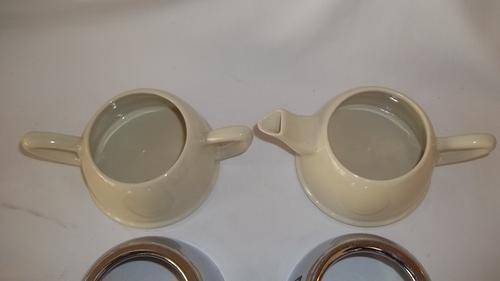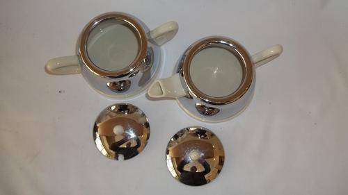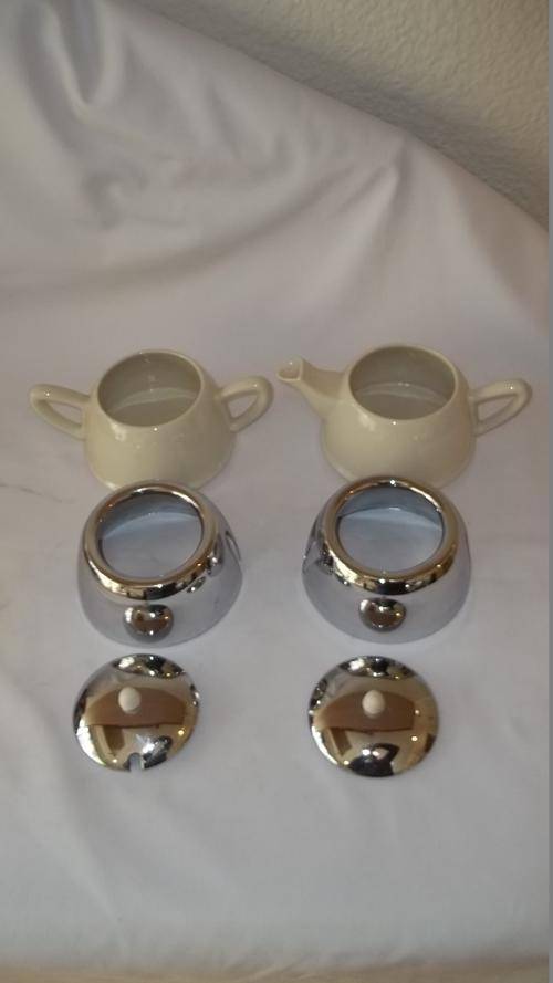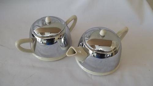 THIS STUNNING 1970's CERAMIC AND CHROME TEAPOT AND SUGAR BOWL ARE IN FANTASTIC CONDITION. THE CHROME DOMES FIT OVER THE CERAMIC BOWLS, GIVING A REAL SEVENTIES STYLE. THERE ARE NO CHIPS OR CRACKS IN ANY OF THE PIECES AND THE CHROME HAS ABSOLUTE MINIMAL WEAR AND TEAR. THIS IS AN AWESOME TWO CUP TEAPOT AND SUGAR BOWL.