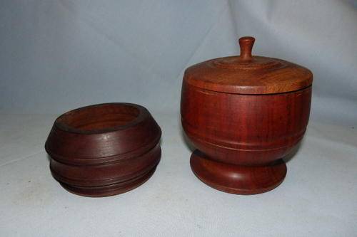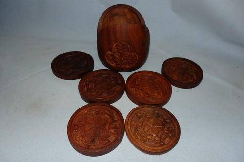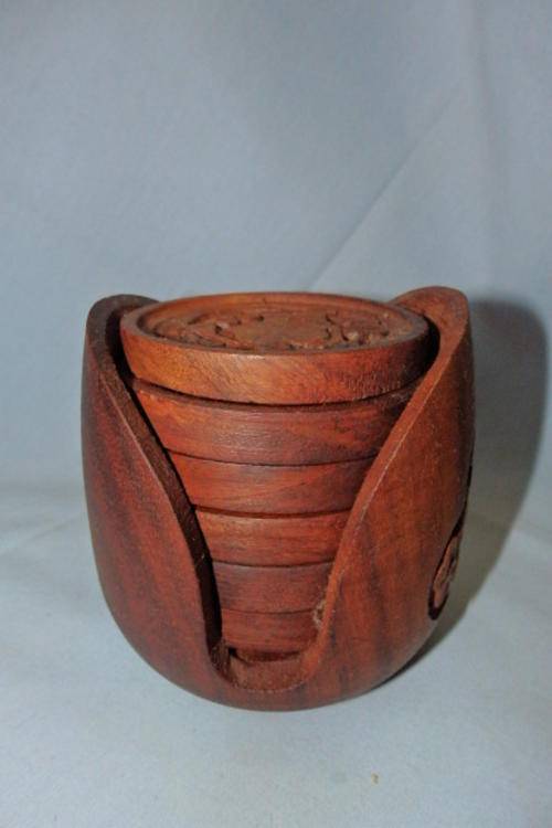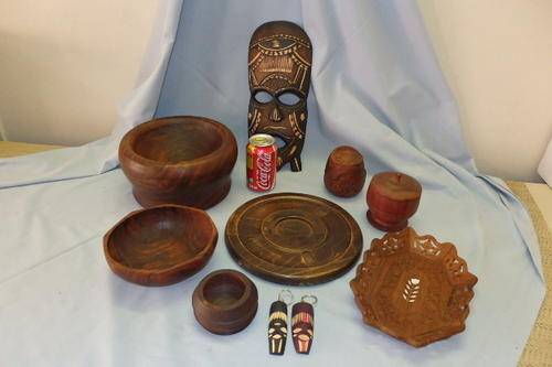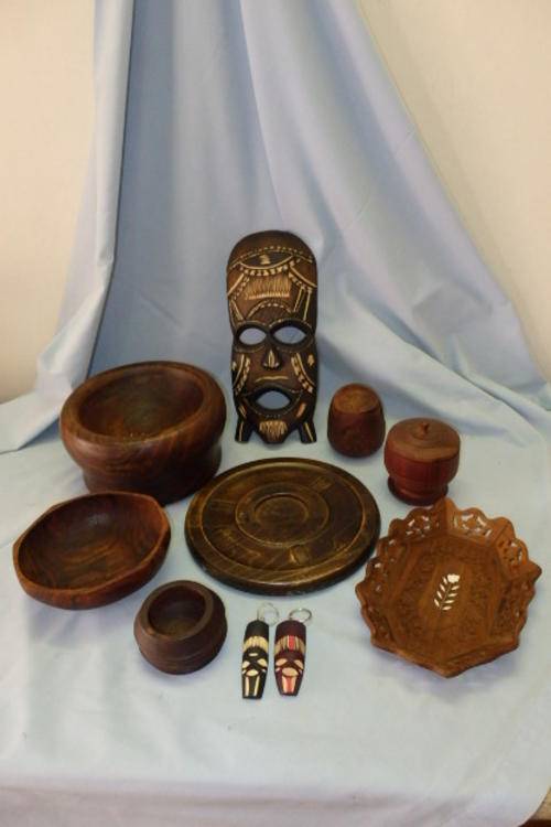 THIS FANTASTIC COLLECTION OF ASSORTED HAND CARVED WOODEN PIECES INCLUDES THREE SNACK BOWLS, A ROUND PLATE OF SORTS, TWO SMALL JARS (ONE IS LIDDED), TWO CARVED KEYRINGS, A MASK AND A SET OF SIX BEAUTIFULLY CARVED COASTERS IN A HOLDER. THE PIECES ARE USABLE. ONE BID FOR THE LOT!!!!.