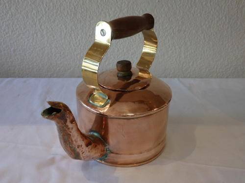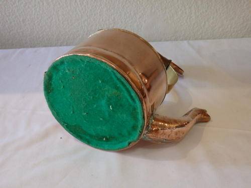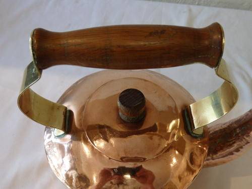 THIS AWESOME COPPER KETTLE WITH A HAND HAMMERED SPOUT HAS A BRASS AND WOODEN HANDLE AND WOODEN KNOB ON THE KETTLE LID. THE KETTLE MEASURES 24cm (SPOUT TO BACK) AND IS 21cm TALL. THE BASE OF THE KETTLE IS LINED IN A GREEN VELD.