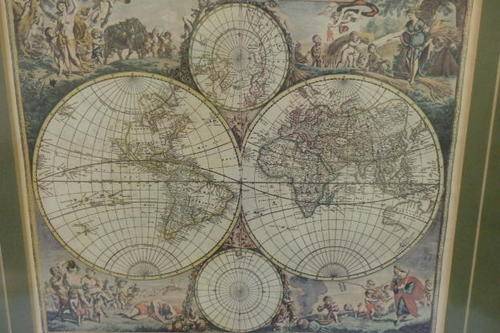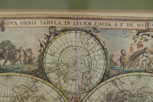 THIS FANTASTIC AND RARE FRAMED PRINT OF THE ORIGINAL ETCHING OF THE EARTH (GLOBE) BY DUTCH MAP MAKER, FREDERICK DE WIT IS TITLED "NOVA ORBIS TABULA IN LUCEM EDITA A.F. DE WIT" AND IS A PRINT OF THE ORIGINAL ETCHING DATING BACK TO THE 1665. THE PRINT MEASURES 55cm ACROSS AND IS 51.2cm HIGH. THERE IS MINIMAL AGE AND USAGE RELATED WEAR AND TEAR AND SCUFF MARKS ON THE FRAME.