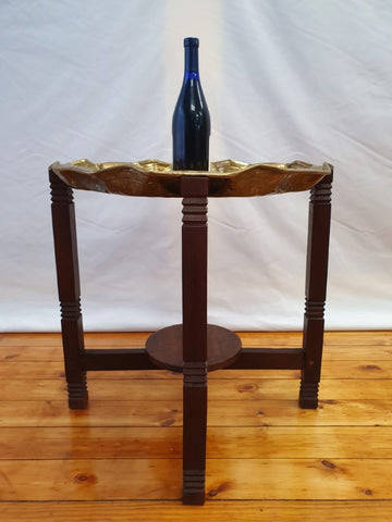 A fantastic hammered brass tray table with a straight leg wood base.