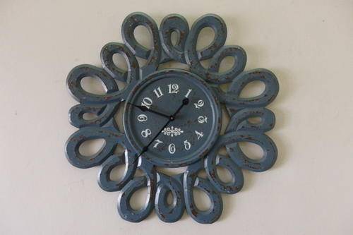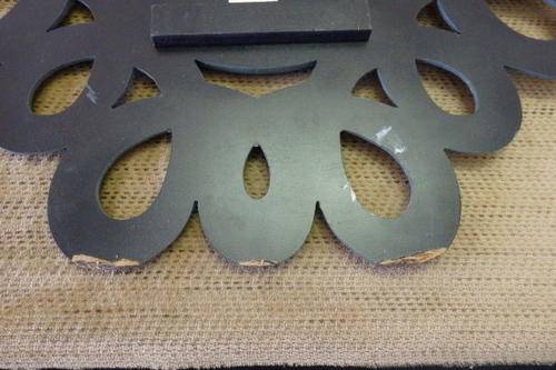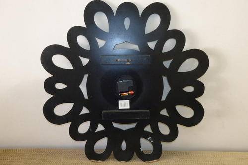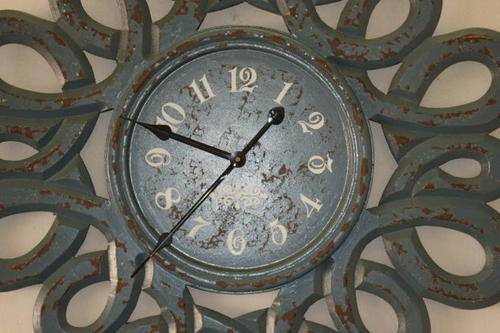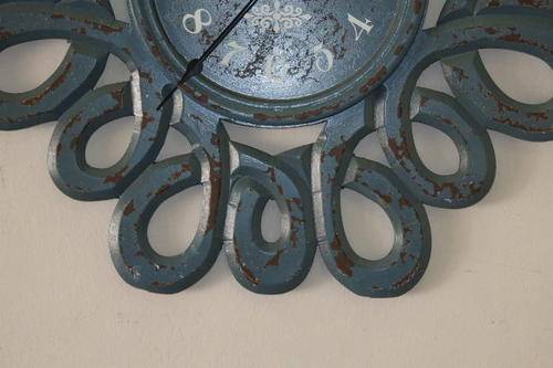 THIS FANTASTIC LARGE MOLDED WOODEN QUARTZ CLOCK WITH A "TWIRLED" DESIGN WITH A VINTAGE "WROUGHT IRON" LOOK IS IN WORKING CONDITION. THE CLOCK MEASURES 59cm ACROSS. THERE IS SOME "DAMAGE" ON THE BASE OF THE CLOCK, BUT IT IS ON THE BACK OF THE CLOCK WHERE IT WOULD BE AGAINST THE WALL. PLEASE NOTE THE BATTERY IS NOT INCLUDED.